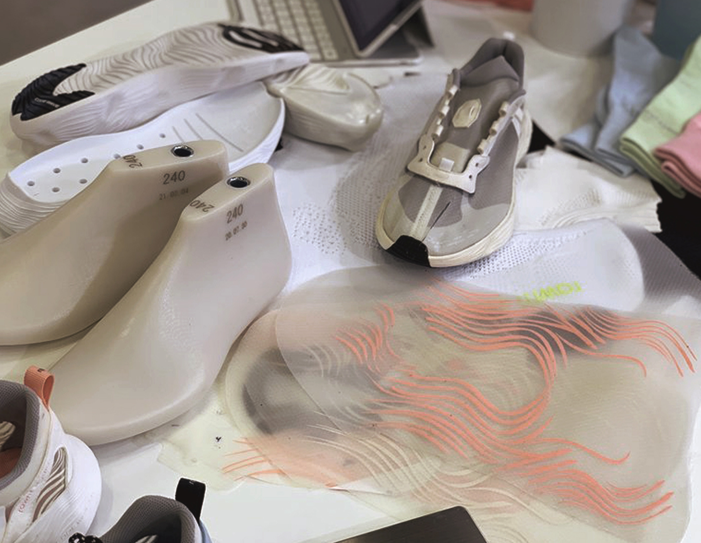 • The Upper pattern uses semi-transparent mono-mesh that has excellent ventilation as well as bringing comfort even when worn for a long period of time. Additionally, due to the see-through characteristic, it is possible to display various styles with the colour of the socks reflected through the shoes.